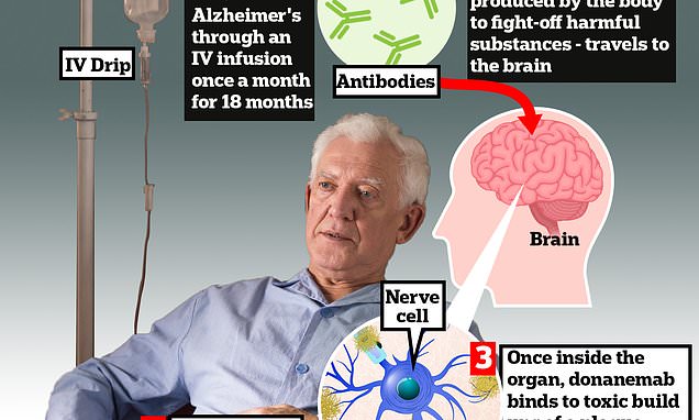 Donanemab is given to Alzheimer’s patients through an IV infusion once a month. The monoclonal antibody — a man-made version of proteins produced by the body to fight-off harmful substances — travels to the brain . Once inside the organ, donanemab binds to toxic build-ups of amyloid plaque — a hallmark sign of the memory-robbing disease. This prompts immune cells, known as microglia, to clear them