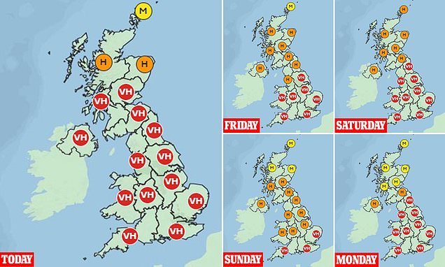 Pollen levels fluctuate between ‘high’ (orange) and very high for the rest of England, Wales and Northern Ireland.