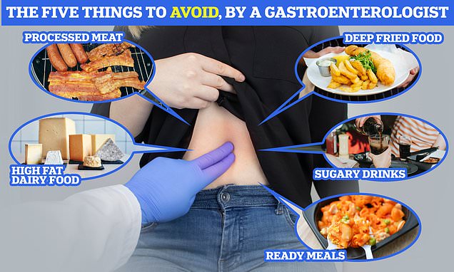 He said: ‘These foods are typically high in fat, although fat-free varieties are available. Saturated fat takes longer to digest, which can exacerbate symptoms of indigestion and reflux while also contributing to inflammation in the gut.’