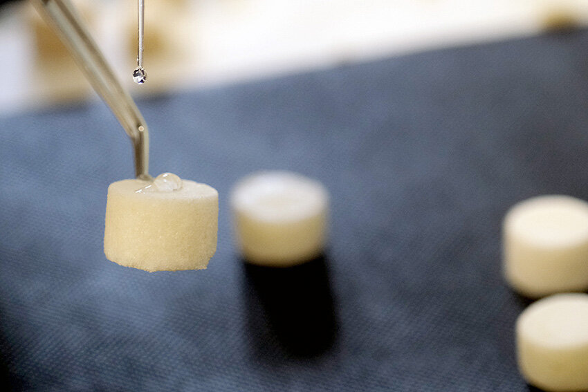 “Using natural by-products of the food industry—soy protein and chitin—we developed a scaffold or spongy matrix that displays a series of very interesting physicochemical properties. It is capable of absorbing huge quantities of water or blood, it has a large surface area to bind and house cells inside it, it does not produce any kind of rejection against the material and, what is more, it partially degrades,” said the UPV/EHU researcher.